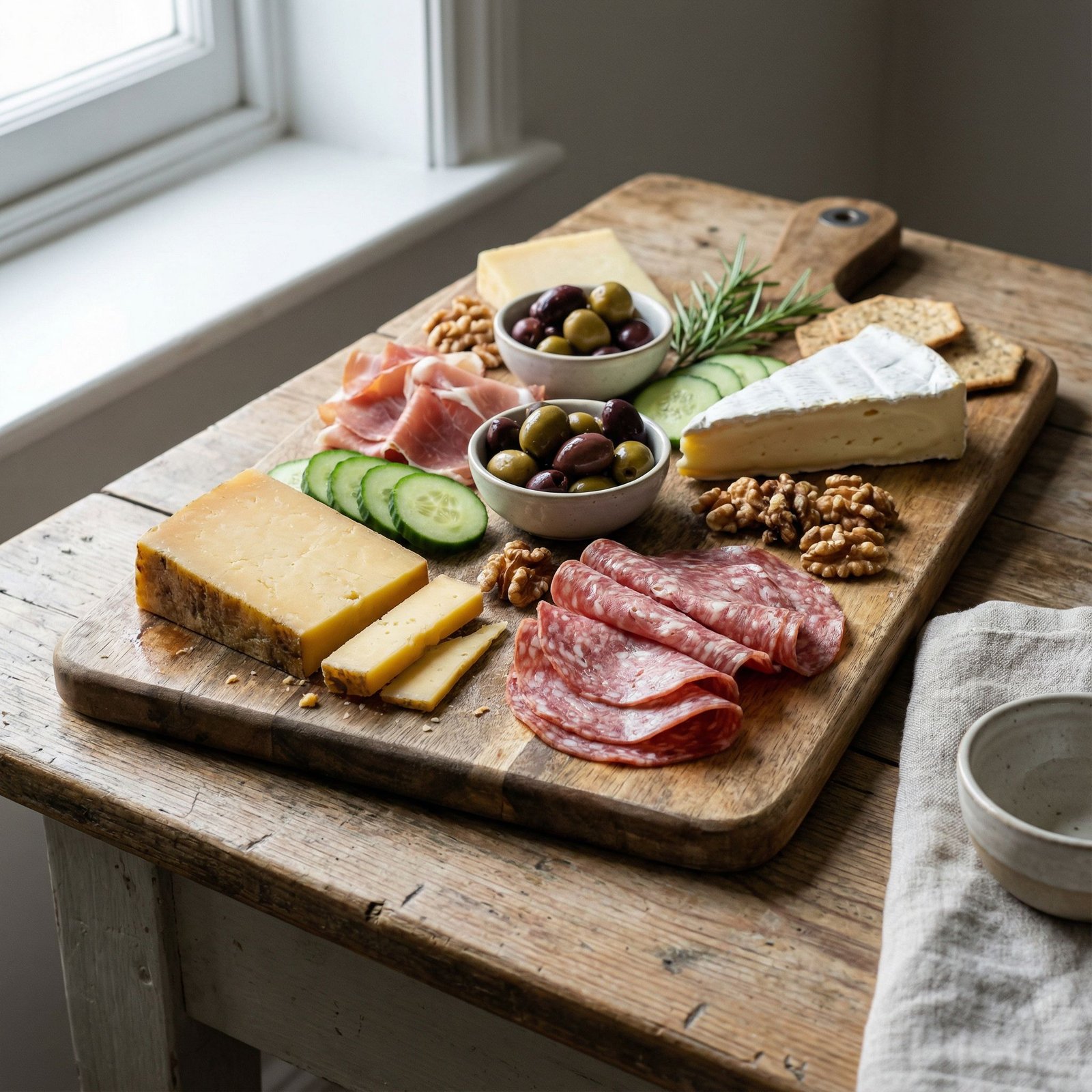 - Lay out the salami and prosciutto, folding or rolling the slices for visual appeal.