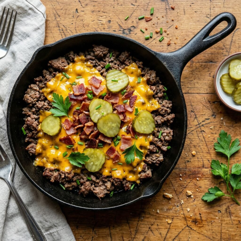 Cheeseburger Skillet with Crispy Bacon and Pickles